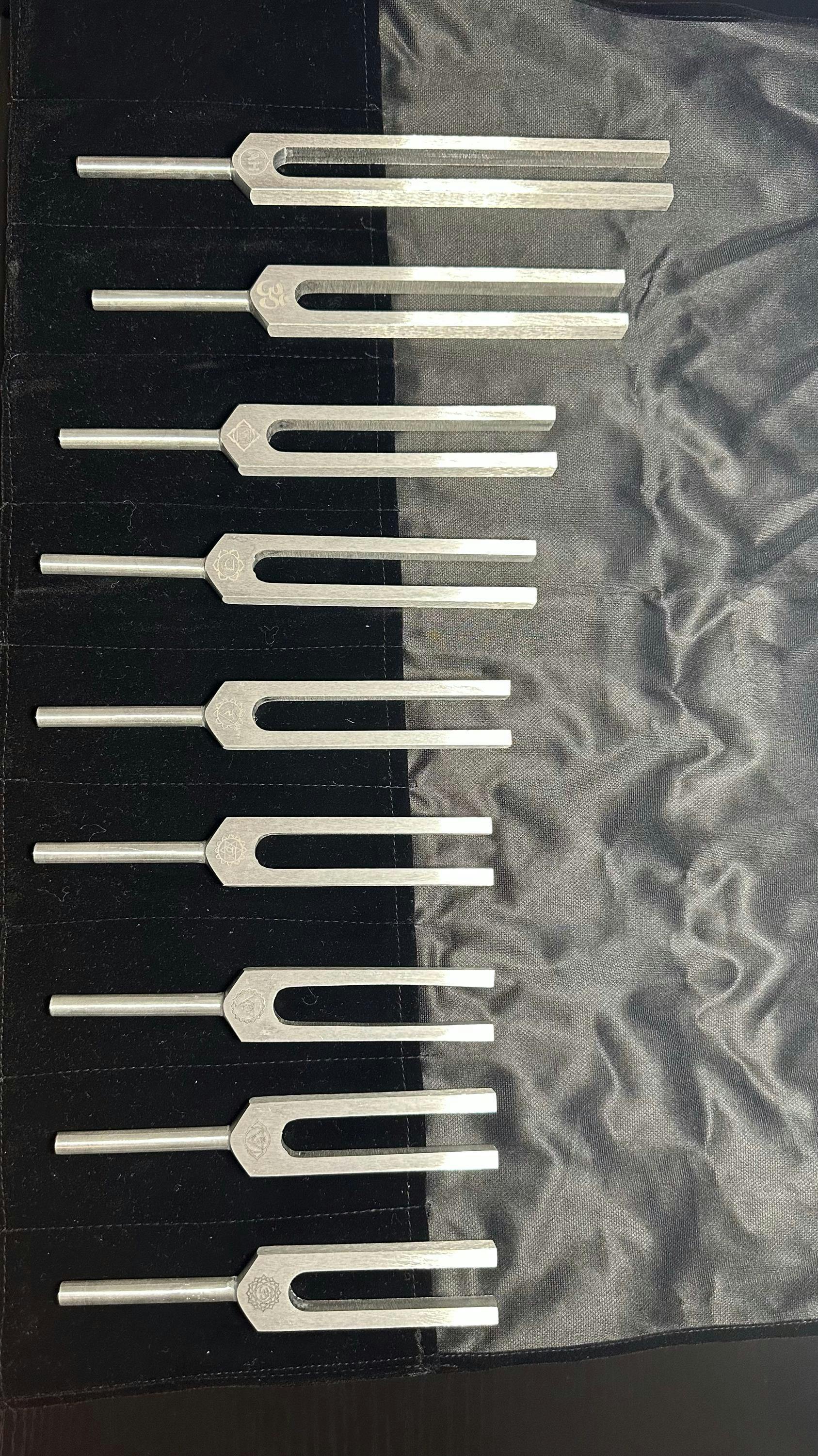 Included with your purchase are 15 Weighted Human Biology Tuning Forks with Velvet Carry Bag, 9 Secret Solfeggio Tuning Forks, and 2 strikers.
