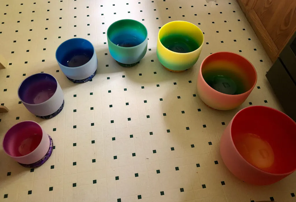 With a full set of singing bowls, you’ll have a wide range of different sounds. The 6” bowl has a very satisfying, pure tone that clears the energy of a room. The 12” bowl is like listening to the bellows of the earth, registering with the core of the body. Lower frequency vibrations are helpful at grounding us into deep meditation. Playing the bowls in ascending and descending order, or in specific harmonies, is an amazing way to play your crystal singing bowls. Balancing and bringing the Chakra system into alignment can result in many positive benefits.