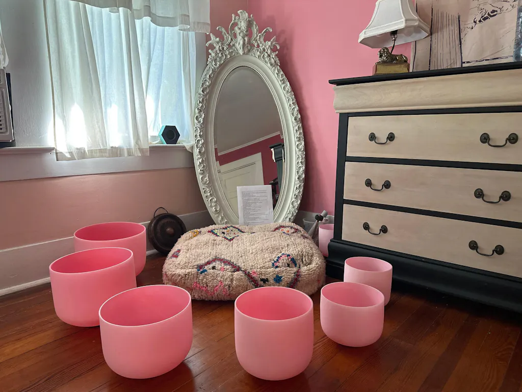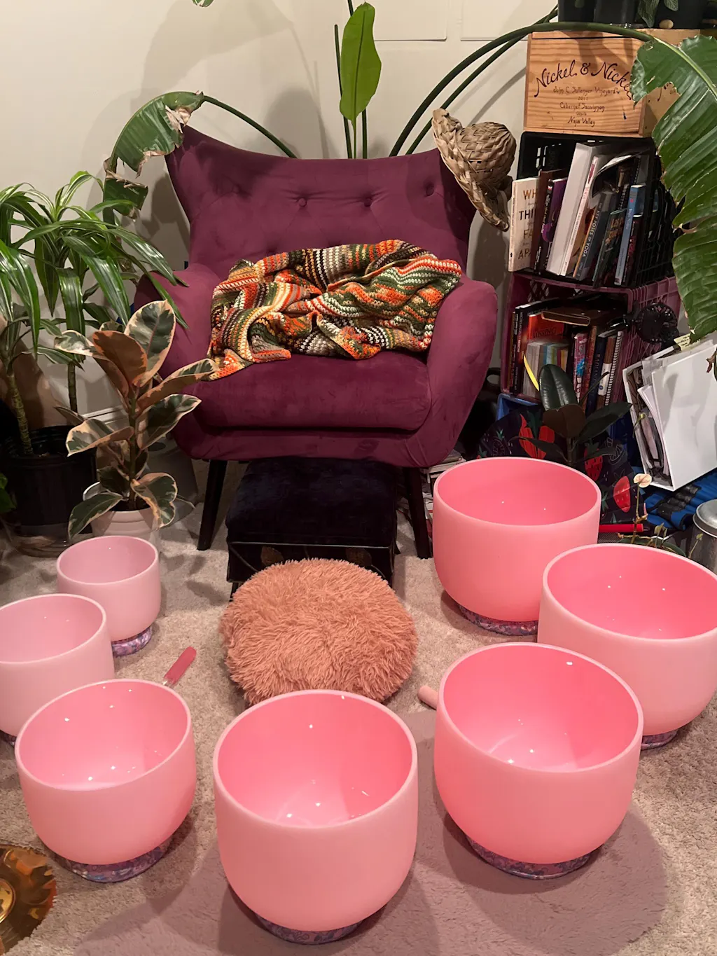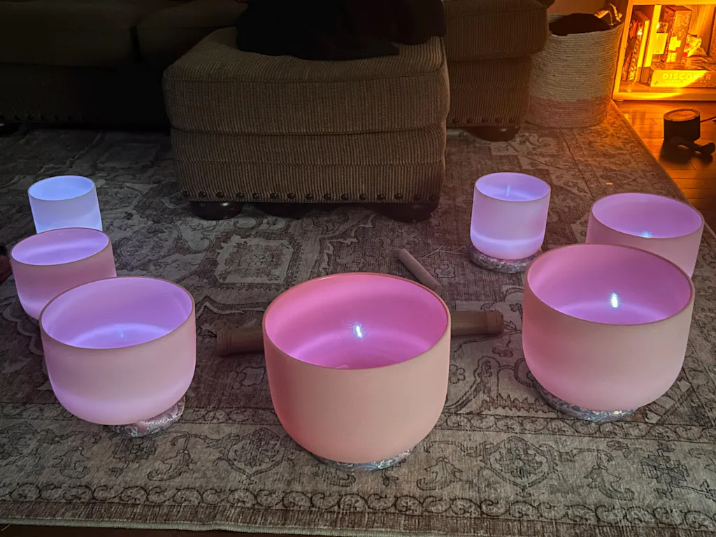 Myriad Melodies' Myriad Melodies' 6-12 Light Pink Singing Bowl Set will astound you with its singing and beauty. This perfect pitch set of bowls is tuned to 432 Hz, a frequency considered to be the musical pitch of nature. Pink is the color of passion and unconditional love, and looks absolutely stunning with this set of crystal singing bowls. These bowls are of the highest quality, they are radiant in the sunlight and are recommended for sound baths and performances.