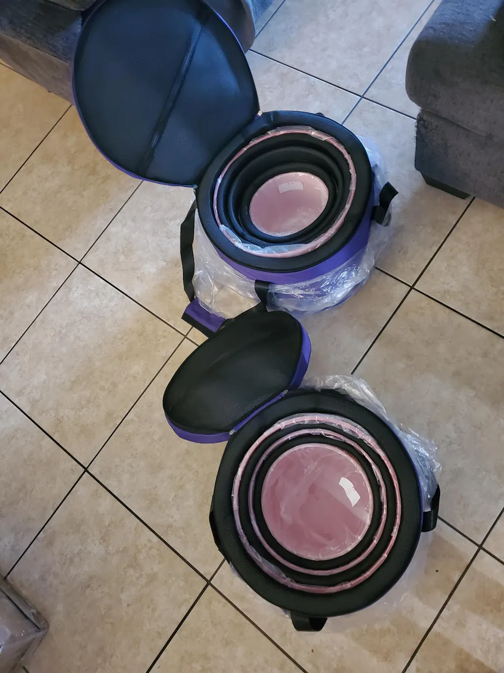 Depending on availability, the purple padded case we send may have a slightly different appearance than the product photos but we are certain that you will be pleased with its quality. The color of the bowls may vary slightly compared to the product photos.